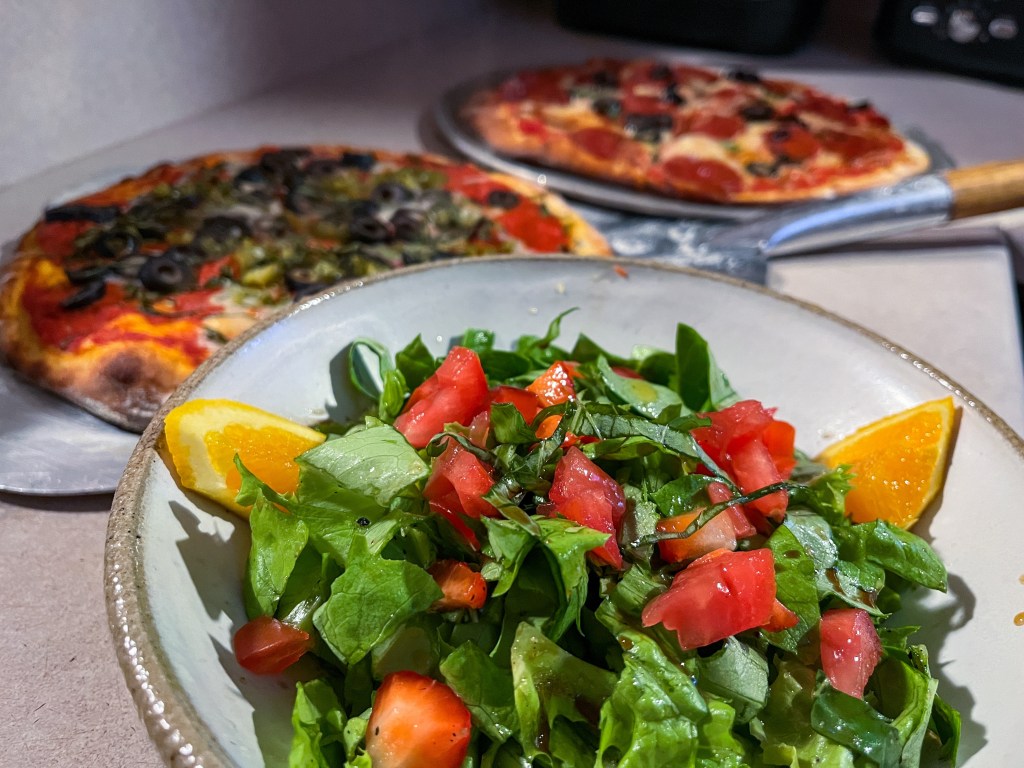 A fresh strawberry balsamic salad sits forefront of two homemade pizzas. -