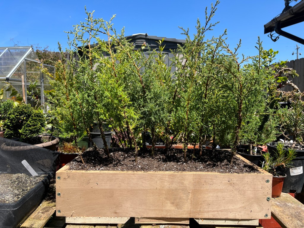 Select the container you will be transplanting into before you begin. Mark made a wood box to house the newly planted bonsai forest. Then he thoughtfully selects the trees he will be working with to create a forest composition.